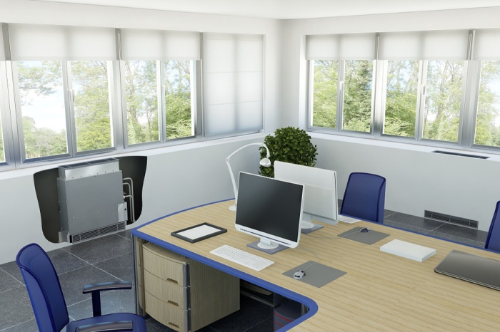 - Напольные встраиваемые блоки наилучшим образом подходят для монтажа в нише под окном благодаря небольшим габаритам: толщина всего 200 мм, высота 620 мм